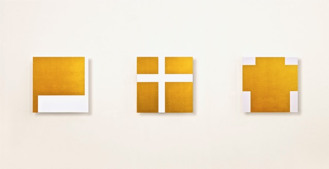 Zo is er o.a. zijn drieluik ‘Transcendental’ uit 2010 te zien. Elk afzonderlijk paneel is 33 x 33 cm, bestaande uit titanium wit en bladgoud 23 karaat op hout.